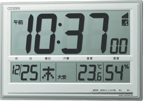 ・12(AM/PM)・24時間表示切替式/温度表示(-9.9℃~50℃)/湿度表示(20~95%)/環境目安表示付(「食中毒」「カビ・ダニ」表示タイプ)/カレンダー表示(2099年12月31日までプログラム)